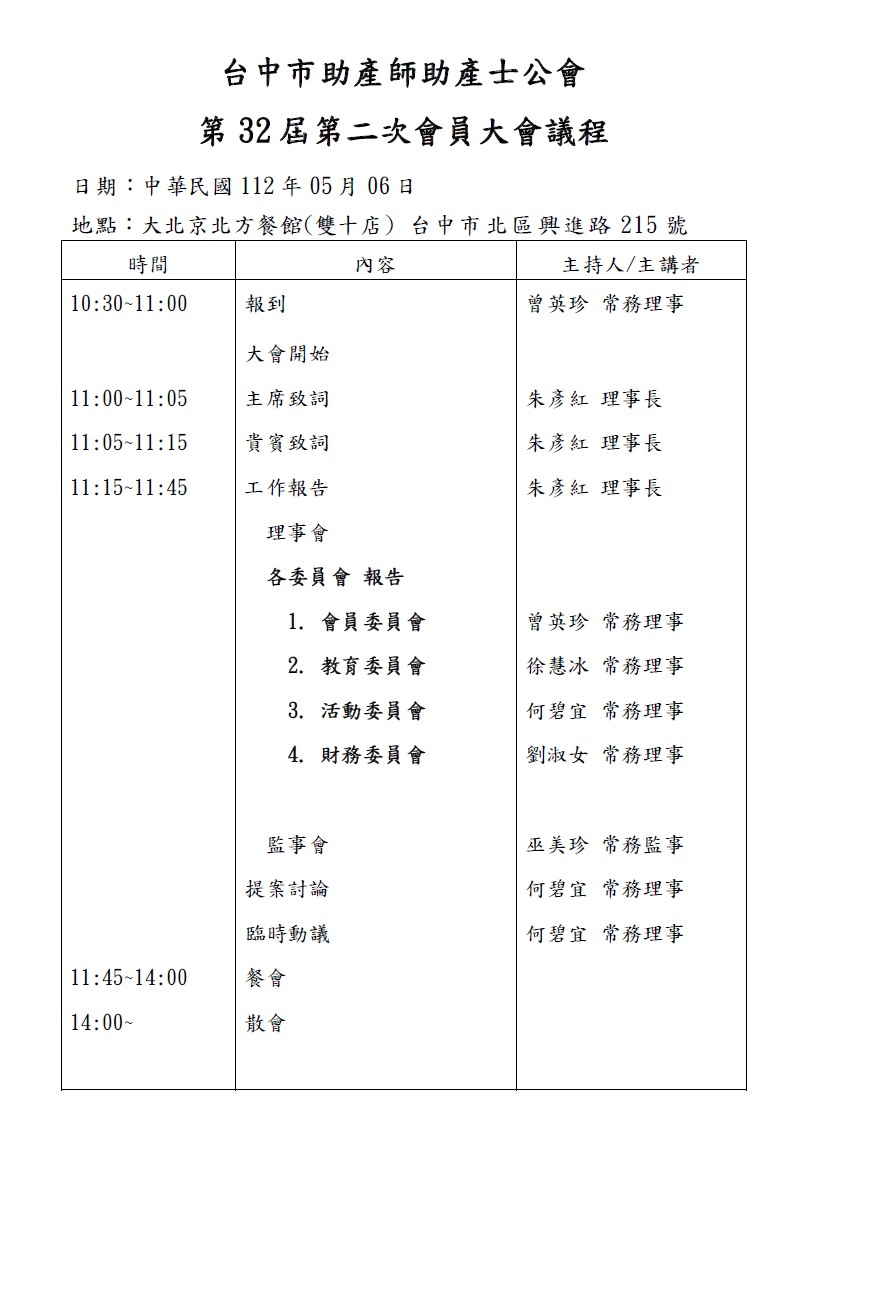 台中市助產師助產士公會 第三十二屆第二次會員大會暨餐會 主旨:本會訂於112年05月6日(星期六)10:30~14: ...